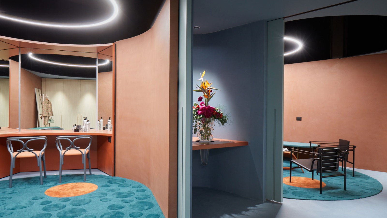 Чтобы создать эти оазисы спокойствия, Миланский театр degli Arcimboldi заказал дизайнерам интерьеров переделку всех гримерных комнат. В 2022 году итальянская студия Calvi Ceschia Viganò воплотила гримерную под названием “Primo Camerino”.